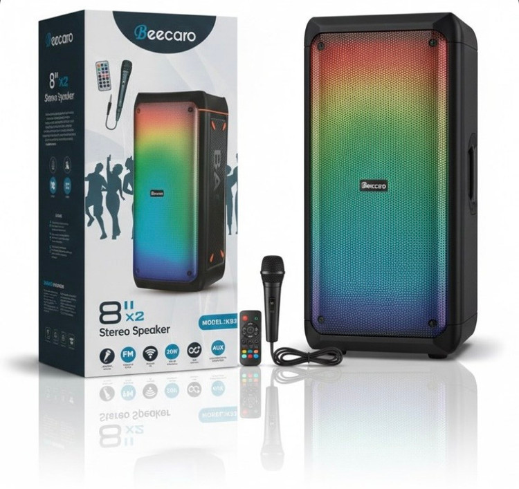 اسپیکر Beecaro KB2 یک پارتیباکس قابل حمل از برند Beecaro است که از بلوتوث نسخه 5 برای اتصال بیسیم پشتیبانی میکند و دارای درگاه USB، کارت حافظه و ورودی AUX است. این مدل مجهز به باتری 4400 mAh، توان خروجی 20 وات، میکروفون (بیسیم)، قابلیت TWS برای اتصال دو اسپیکر، رادیو FM و رقص نور است. ابعاد آن 249×238×528 mm میباشد.